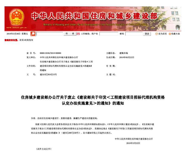 《住房城鄉建設部關于廢止<工程建設項目招標代理機構資格認定辦法>的決定》已經2018年2月12日第37次部常務會議審議通過,現予發布,自發布之日起施行。