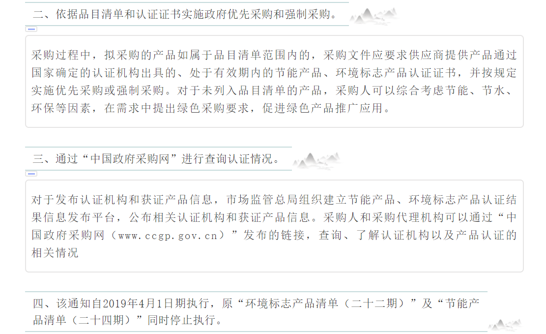 二、 依據品目清單和認證證書實施政府優先采購和強制采購。采購人擬采購的產品屬于品目清單范圍的,采購人及其委托的采購代理機構應當依據國家確定的認證機構出具的、處于有效期之內的節能產品、環境標志產品認證證書,對獲得證書的產品實施政府優先采購或強制采購。
