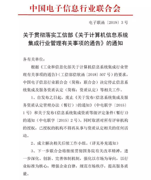 2014年3月,工信部發(fā)布《關于做好取消計算機信息系統(tǒng)集成企業(yè)資質(zhì)認定等行政審批事項相關工作的通知》通知表明,該資質(zhì)認定在取消行政審批后,認定工作相移交給中國電子信息行業(yè)聯(lián)合會負責實施。